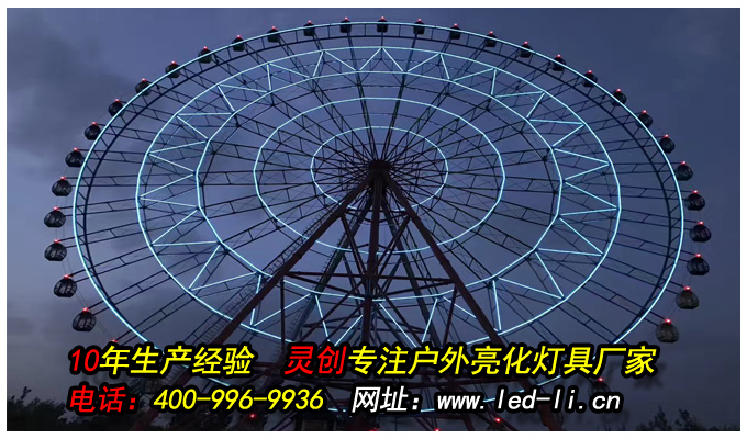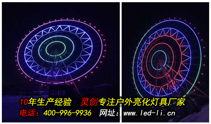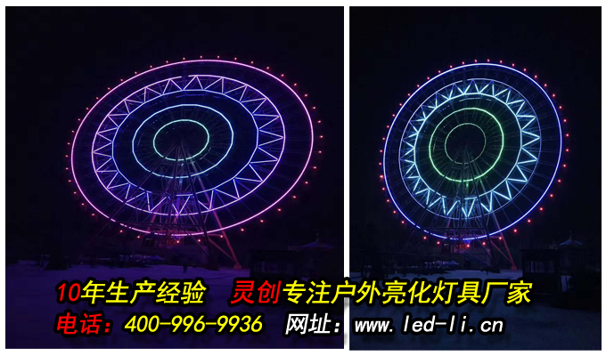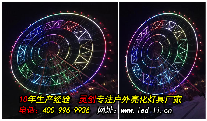 摩天輪主輪轂上和一些臂膀上安裝主要是采取扎帶是捆綁安裝,主要燈具則是使用了LED數(shù)碼管鋁槽灌膠帶pc罩子,燈具采用的是全彩DMX512八段控制方式。燈具的控制優(yōu)點(diǎn)則是一個(gè)燈具信號(hào)出線(xiàn)問(wèn)題,不會(huì)影響下一根的程序跑動(dòng),從而保證整個(gè)主題效果不會(huì)出現(xiàn)由于燈具信號(hào)線(xiàn)問(wèn)題影響整體效果。下面欣賞整體現(xiàn)場(chǎng)調(diào)試效果圖。