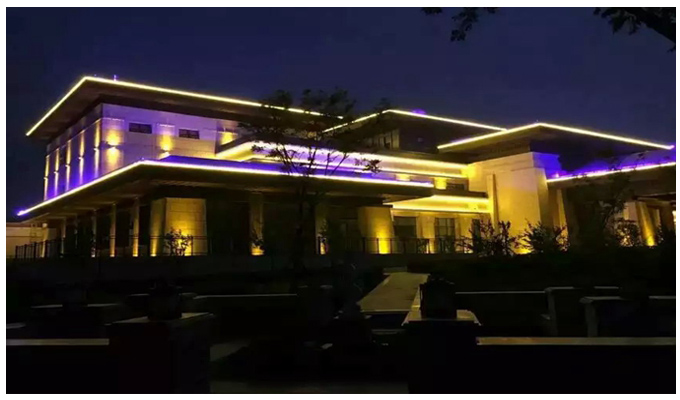 別墅亮化的主色調(diào)為藍(lán)光和黃光的相互結(jié)合,藍(lán)色是泰式文化里面非常重要組成色彩元素之一,而黃色則是我們中式文化里面最為尊貴的色彩。兩種的色彩相互搭配,顯示出了中泰文化的相互融合在別墅群里面。別墅的亮化手法上主要運(yùn)用輪廓照明以及泛光照明,使用LED洗墻燈為墻面打亮,在配上LED線條燈作為建筑輪廓使用,在別墅的墻面一些重要的圖案區(qū)采用LED壁燈進(jìn)行照明光影的效果呈現(xiàn)。