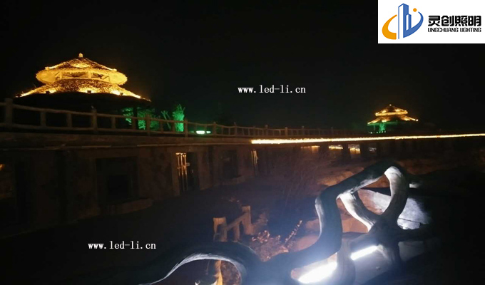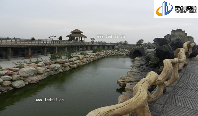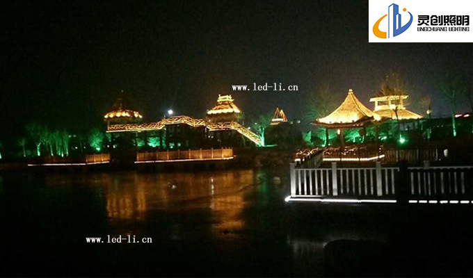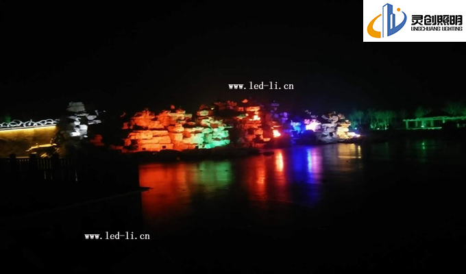 假山上燈光要把整個(gè)假山給烘托出來,色調(diào)上我們采用了七彩的顏色進(jìn)行燈光安裝。用LED泛光燈不同的位置安裝不同的顏色,亮燈實(shí)際效果達(dá)到色彩斑斕的設(shè)計(jì)格調(diào)。湖面上的橋梁我們采取了LED洗墻燈進(jìn)行燈光打亮,在湖面的人行道周邊安裝LED線條燈進(jìn)行輪廓照明,也起到一個(gè)夜間照明的效果。特別是休息的涼亭位置,頂部全部打亮,使得整個(gè)園區(qū)的夜間照明亮度一下子就提高了。