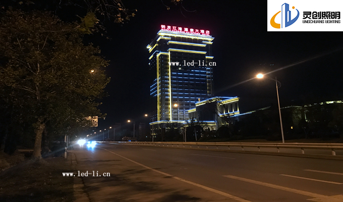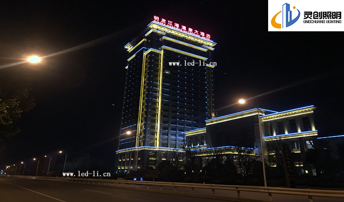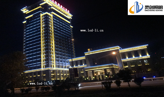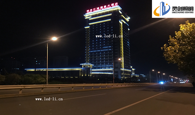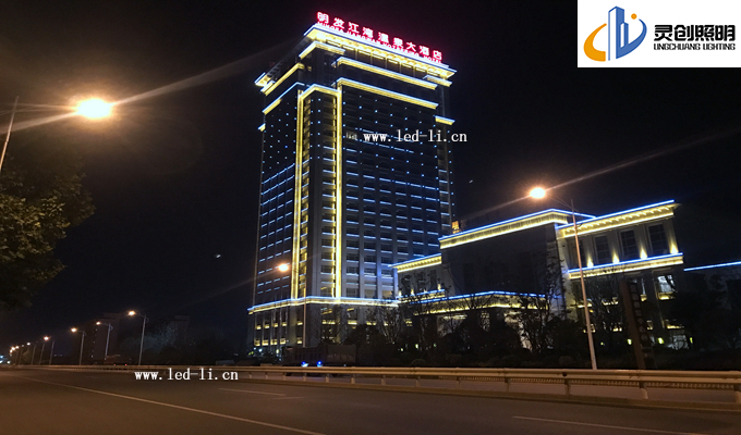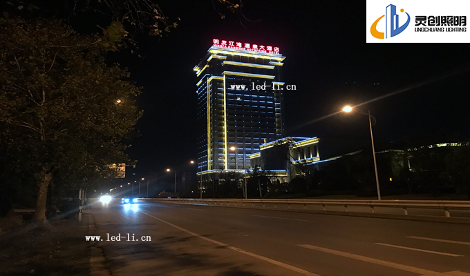 方面二:大酒店的腰際線位置,考慮到入住酒店客人的夜間視覺感,我們都不在窗戶邊上安裝大功率的燈具,而是采用了小功率的LED線條燈進行輪廓體現(xiàn),這邊由于安裝效果上的體現(xiàn),我們把效果更為升級,實現(xiàn)了屏幕效果,酒店四個面進行同步亮燈效果,當(dāng)人們視覺由遠(yuǎn)到近的時候看到是一個充滿活力的建筑。調(diào)試階段最為難度大的也是這四個面的同步效果,再次感謝前面的一線安裝人員和技術(shù)人員。