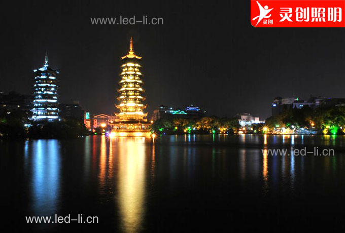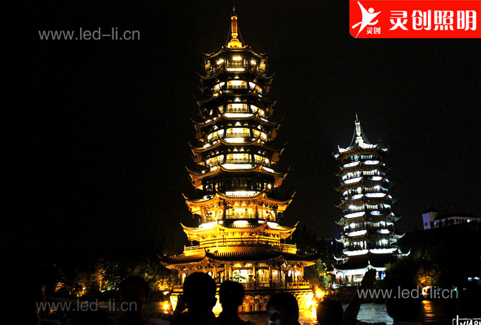 日月雙塔亮化夜景 具體為LED單黃投光燈 LED單白投光燈