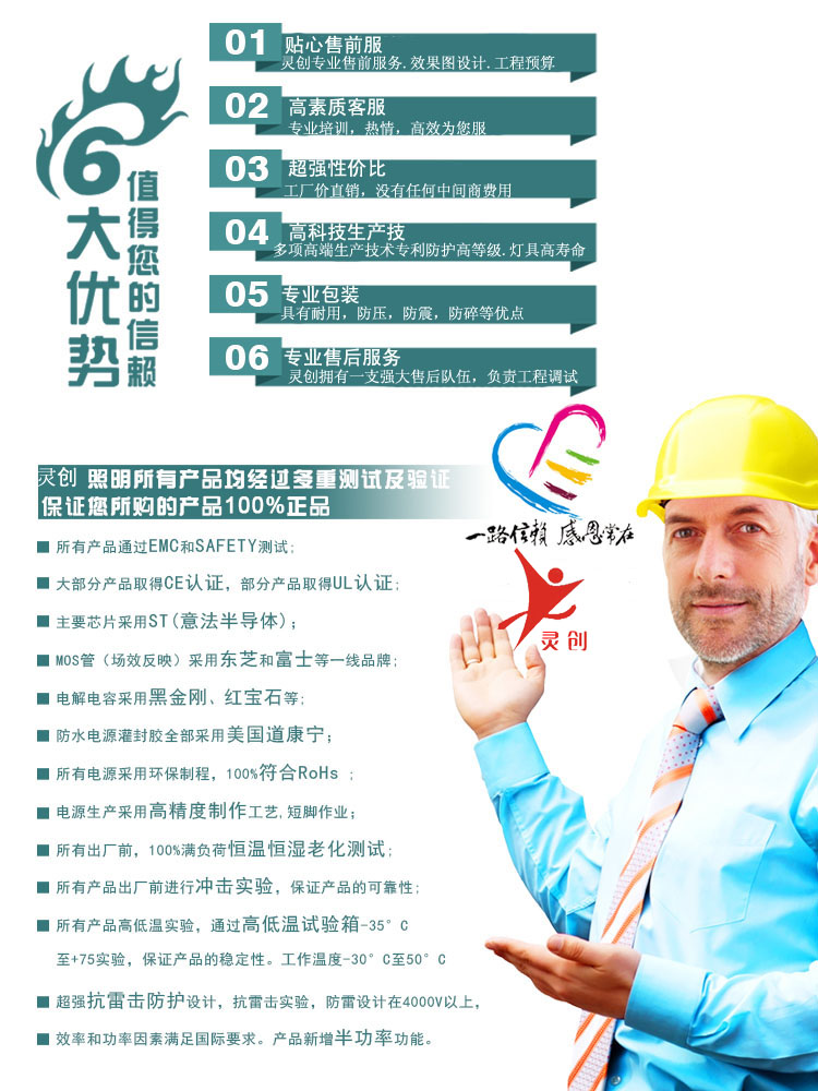 選擇靈創(chuàng)照明6大理由 壽命長(zhǎng) 材料優(yōu)質(zhì) 節(jié)能省電 專業(yè)專注 技術(shù)支持 防水散熱