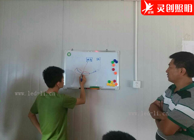 下面為我們靈創(chuàng)照明莫經(jīng)理在跟甲方的人員進行摩天輪的安裝技術(shù)上的探討,這次摩天輪主要以DMX512帶鋁槽數(shù)碼管以及常規(guī)外控的點光源為主。這次探討有一個來小時,在畫板上進行了512連線方式的演練。在甲方提出各種安裝上去后有可能會出現(xiàn)的燈具故障的問題上,徹底解決了甲方對連接方式上的顧慮。